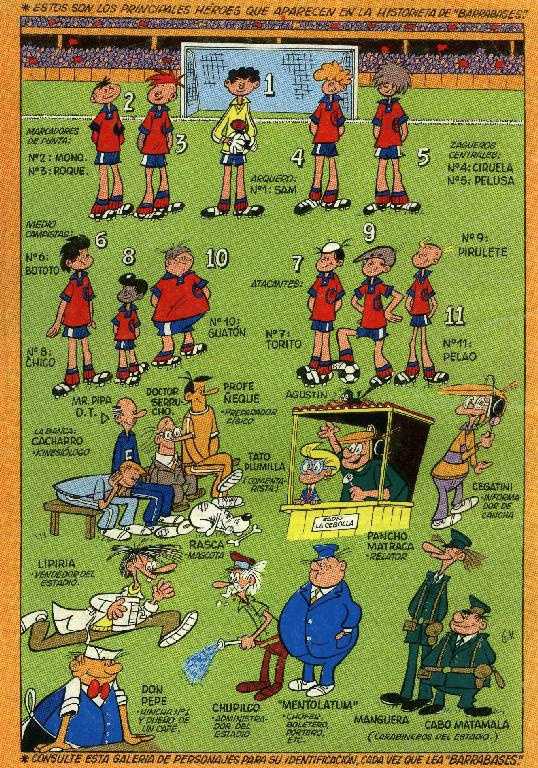 Si te gusta el fútbol sin duda disfrutarás con las aventuras de este equipo de fútbol infantil conocido con el nombre de "Barrabases". Esta popular revista fue creada el año 1954 por Guido Vallejos, creador de varias publicaciones de historietas nacionales durante las décadas de los años 60 y 70 (la edad de oro del comic nacional). Dirigido por Mister Pipa, un viejito pelado y de bigote mosca, el equipo de Barrabases se compone de 11 niños que lo dan todo en la cancha para obtener el triunfo de su club deportivo. Destacan en el plantel las figuras de Pirulete (el goleador del equipo) el arquero Sam, Guatón (siempre echando la talla y metiéndose en lÃos) Bototo, Chico, Pelusa, Palmatoria, Torito y muchos otros. Las aventuras de este grupo transcurren en el tranquilo pueblo de Villa Feliz, un modesto pueblito rural del sur de Chile que tiene un estadio de madera y un corazón de oro. La caracterÃstica principal de la revista son los apasionantes partidos de fútbol en los cuales muchas veces el equipo va perdiendo, pero a última hora logran el triunfo con los espectaculares goles de Pirulete, Guatón o Chico (PodrÃa ser asà también en los encuentros de la selección chilena). Destacan en esta publicación la gran galerÃa de personajes secundarios que acompañan la trama de cada capÃtulo poniendo la nota humana y también humorÃstica de la revista; ejemplo de ello son los personajes Lipiria, don Pepe, el Doctor Serrucho, el Profe Ñeque, el Che Bombacha, el Señor Ricachón y muchos otros. Otra caracterÃstica de esta publicación es la gran cantidad de adversarios que han enfrentado a través de su larga historia "No hay enemigo chico" es el dicho de Mr Pipa que resume su preparación para un encuentro local con la misma concentración y profesionalismo que lo harÃa con algún equipo internacional. La revista Barrabases se ha publicado con interrupciones durante distintos años; la última de ellas comenzó el año 1998 y aún se publica en la actualidad haciendo las delicias de los amantes de la historieta y deporte del balón pie. |