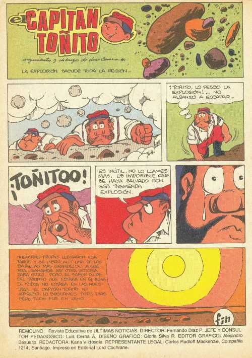 CLASICOS DEL COMIC PRESENTA: "EL CAPITÁN TOÑITO" Por el Prof. Héctor Muñoz A. Cada cierto tiempo me da por hacer órdenes dentro de la casa en los cuales, además de botar los cachureos acumulados, reordeno los comics que tengo distribuidos por distintos lugares. En esto estaba cuando revisando unas cajas me encontré con unos suplementos de diario envejecidos por el paso de los años. En ellos se narraban las aventuras del Capitán Toñito, un personaje que entretuvo mis horas de infancia, junto con las de mis hermanos y muchos otros niños de la década del 70. El Capitán Toñito fue creado por el periodista nacional Luis Cerna Alvarado (creador de otros personajes como Perico Poncho, el Peuco Larraín y muchos otros de los cuales hablaré en otra oportunidad) nacido en el suplemento dominical Remolino del diario Las Últimas Noticias (una publicación destinada a entretener a los niños y a ayudarlos en sus tareas escolares) en su edición número 4 nos presentaba a Toñito, un niño huérfano quien era encontrado en el desierto de Atacama por tres soldados chilenos vestidos con el uniforme de la Guerra del Pacífico (las historias transcurrían en esa época). Toñito es tomado a cargo del sargento Anselmo, quien iba a cargo de los soldados que lo encontraron. Él se transforma en un padre para él y le da su ropa característica: una chaqueta y el quepi del ejército chileno de esa época. A lo largo de la serie se desarrollaron varias líneas argumentales las cuales se entregaban en capítulos de dos hojas que continuaban domingo a domingo. A traves de estas páginas desfilaron personajes como el siniestro Negro Carrizo, soldado del ejército del Perú que odiaba a Toñito con todas sus fuerzas, la Cantuta, el profesor Locodio, el compadre Floro y Filimón, un simpático Lorito que ponía la nota humorística en la serie. ![]() El éxito de Toñito llegó a tal grado que incluso originó una campaña en el diario denominada "La Hermandad de Toñito" donde niños de todo el país enviaban su foto al diario para que la publicaran convirtiéndose en hermanos del capitán Toñito. Desgraciadamente para los lectores su creador quiso dar un término a la serie y para ello en el capítulo final de su ultima aventura contra el Negro Carrizo provoca la explosión de un cargamento de municiones, tras el cual no se encuentra a Toñito por ningún lado. ¿ Había planeado Luis Cerna matar al personaje o pensaba hacerlo reaparecer milagrosamente en una nueva saga de la serie?. Lamentablemente nunca tuvimos respuesta a estas interrogantes. ![]() |